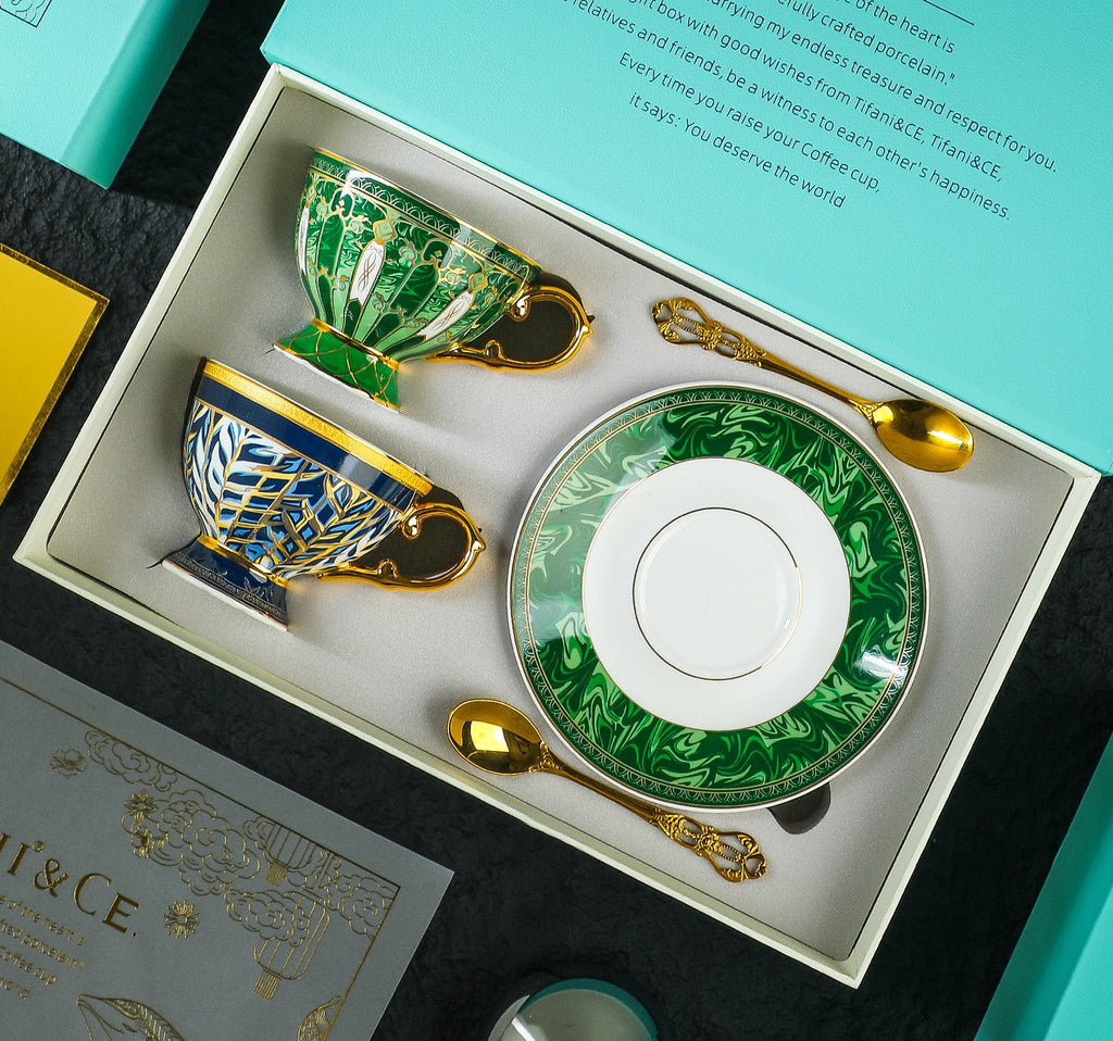 2 tea Cup and Saucer in one gift box.Beautiful ceramic tea cups, perfect for serving espresso, cappuccinos, lattes or tea. It has enough space for coffee with milk bubbles, avoiding spilling.
