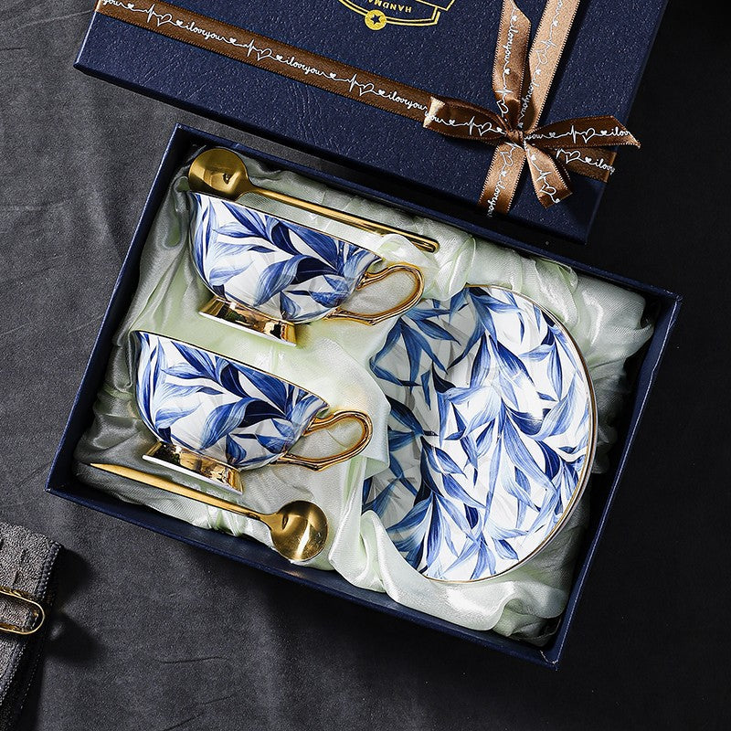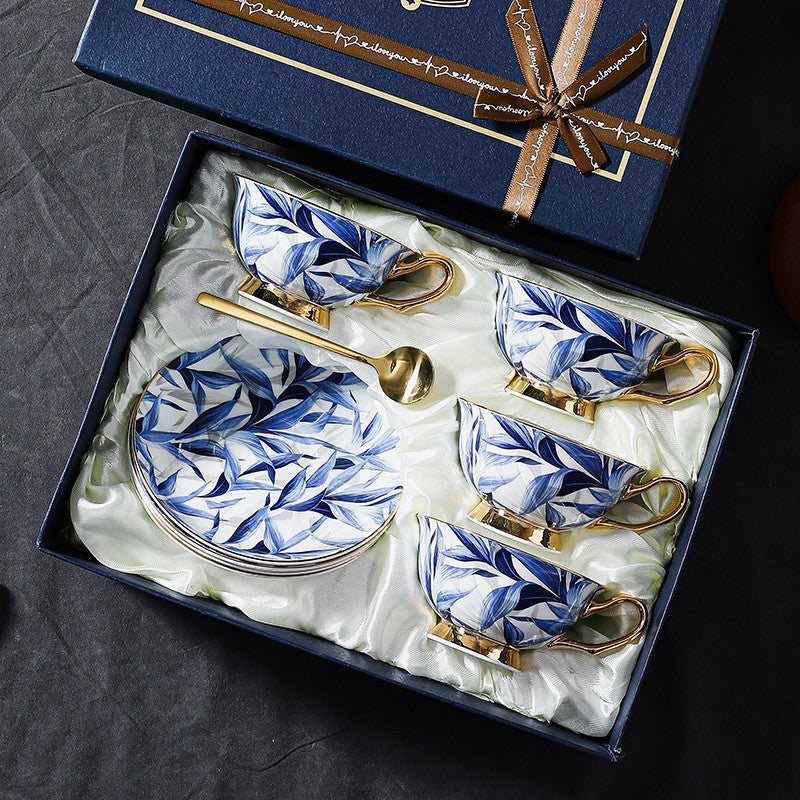 Blue Bone China Porcelain Tea Cup Set, Elegant British Ceramic Coffee Cups, Unique British Tea Cup and Saucer in Gift Box