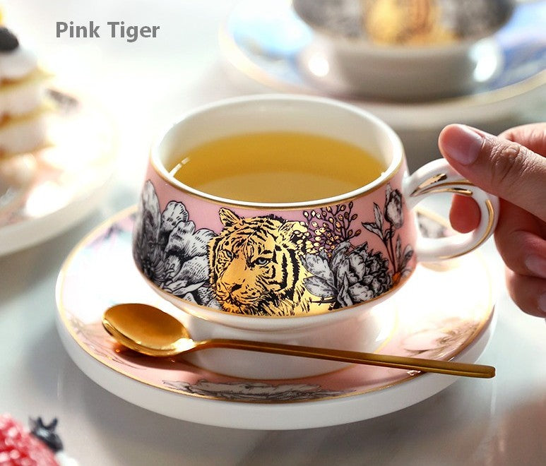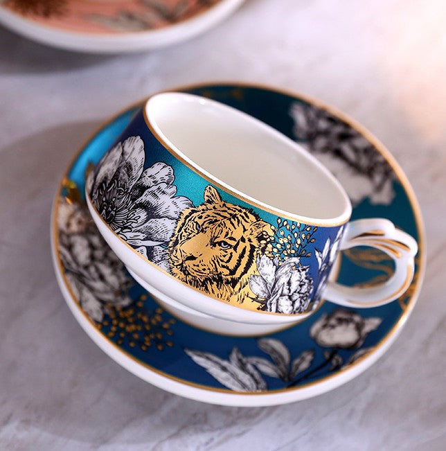 Unique Ceramic Cups with Gold Trim and Gift Box, Creative Ceramic Tea Cups and Saucers, Jungle Tiger Cheetah Porcelain Coffee Cups