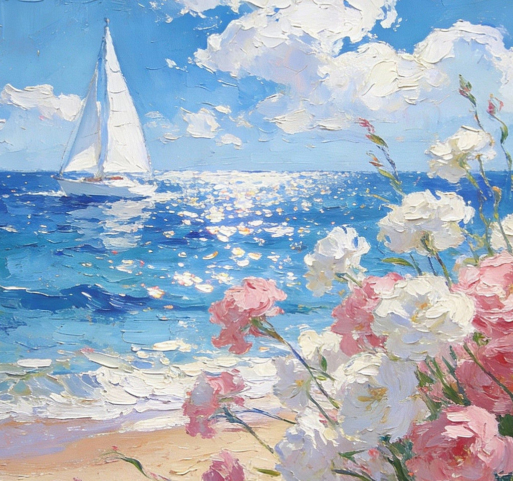 Blooms by the Shore, A Sailboat’s Journey, Simple Painting Ideas, Hand Painted Wall Art, Small Wall Paintings, Landscape Canvas Paintings, On Canvas Small Paintings-HomePaintingDecor
