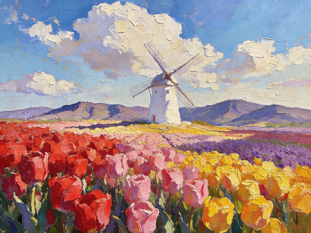 Windmills Amidst the Blooming Tulip Fields, Small Landscape Paintings, Small Oil Paintings on Canvas, Small Canvas Paintings, Original Oil Paintings, Hand Painted Canvas Art, Simple Painting Ideas
