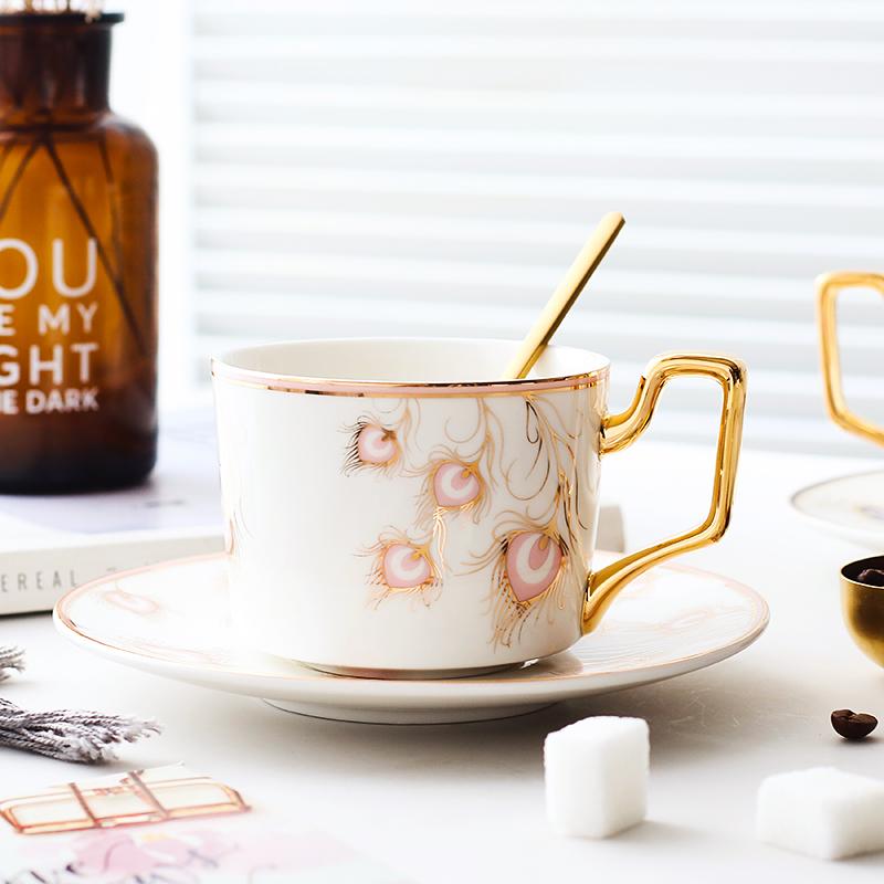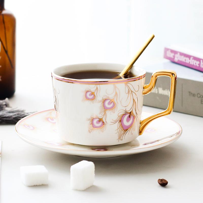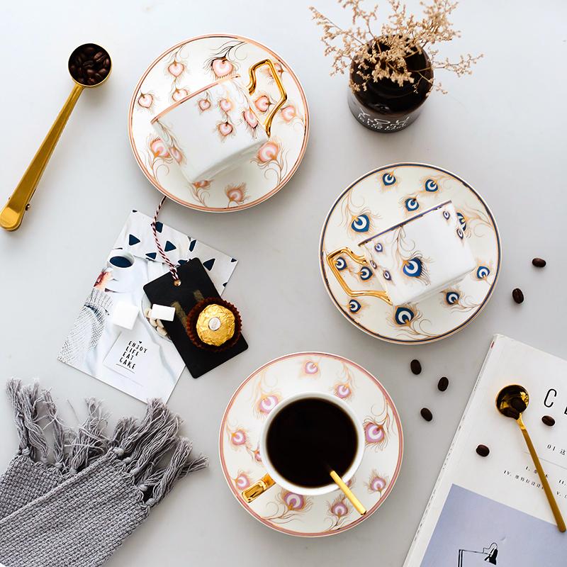 Peacock Tail Pattern Porcelain Coffee Cups, British Tea Cups, Coffee Cups with Gold Trim and Gift Box, Tea Cup and Saucer